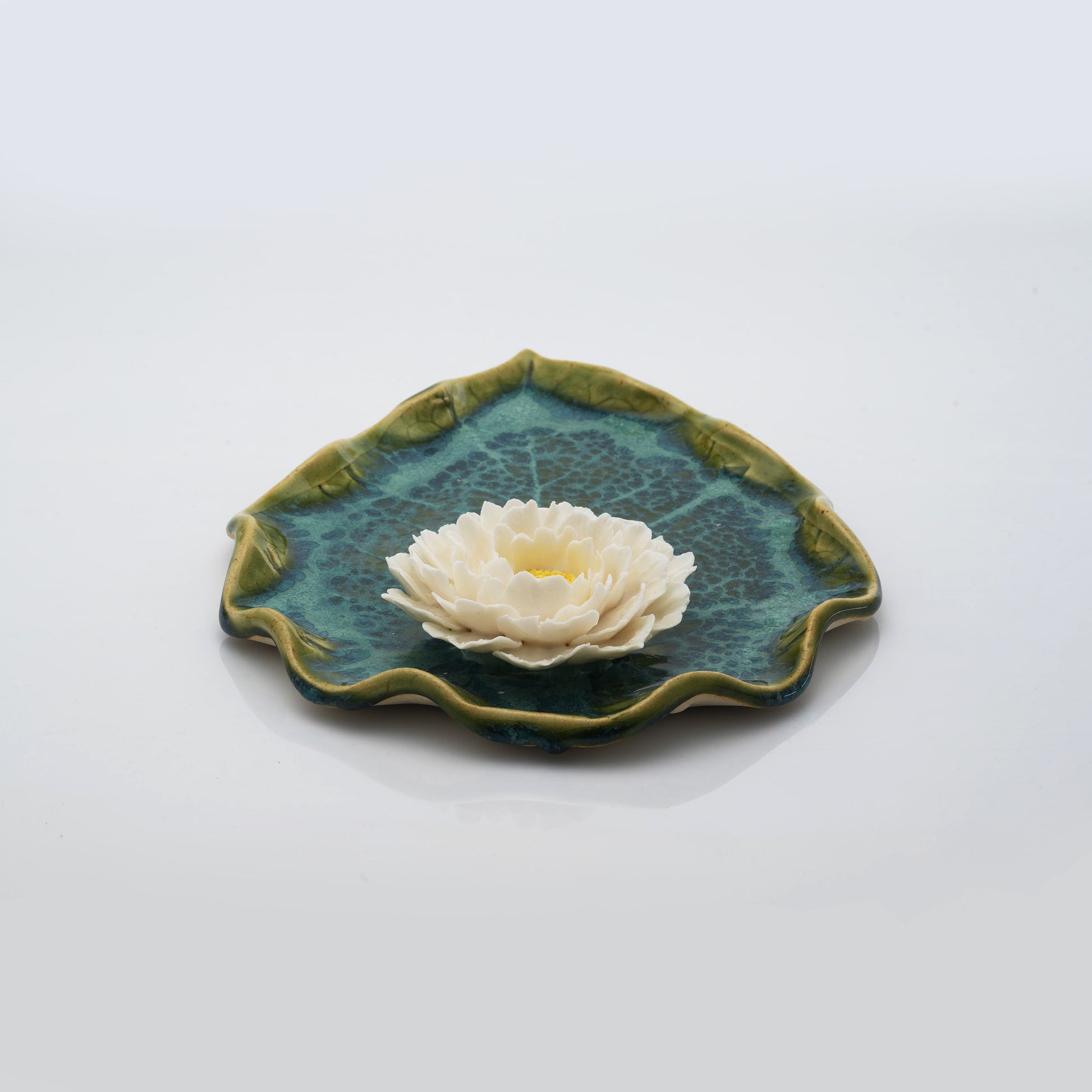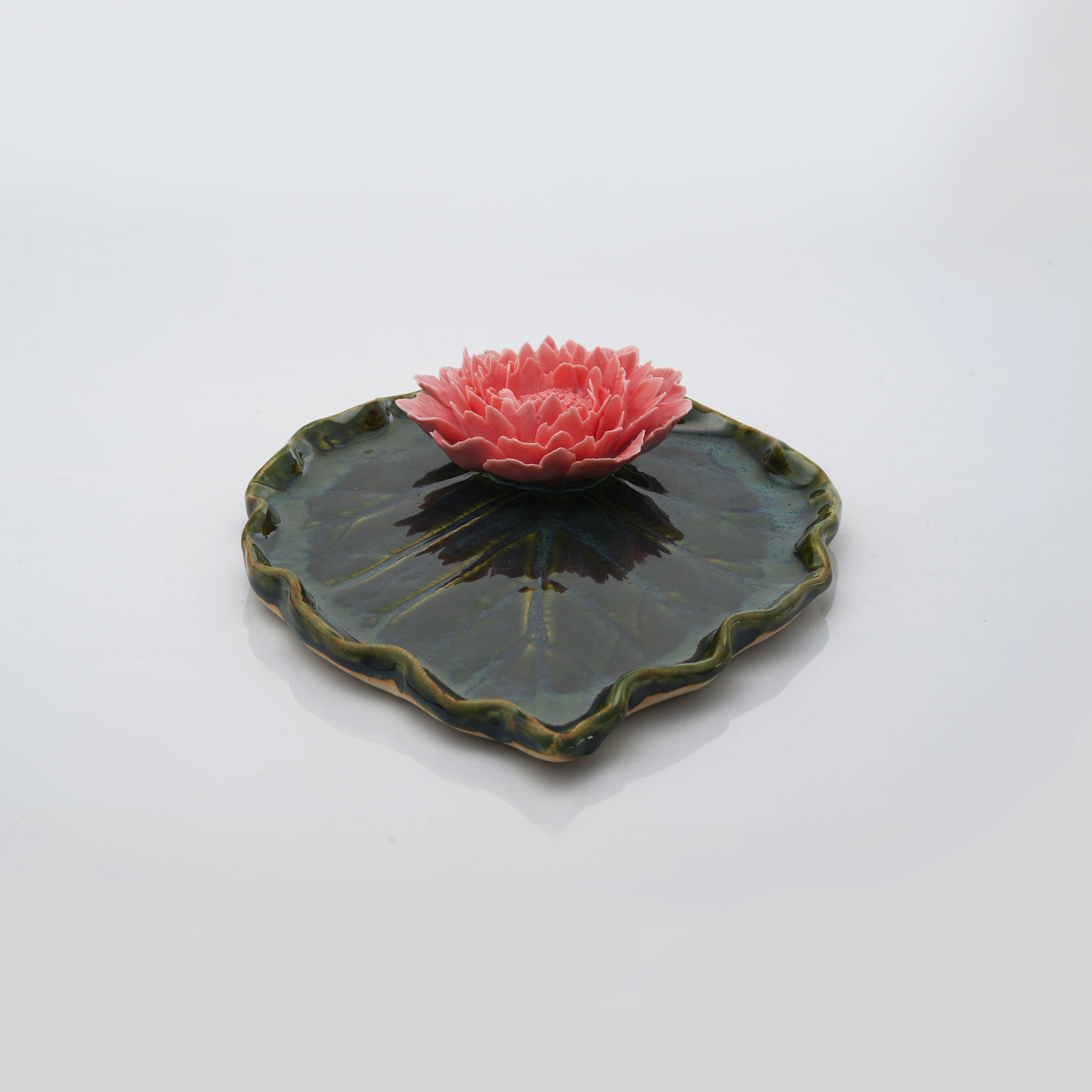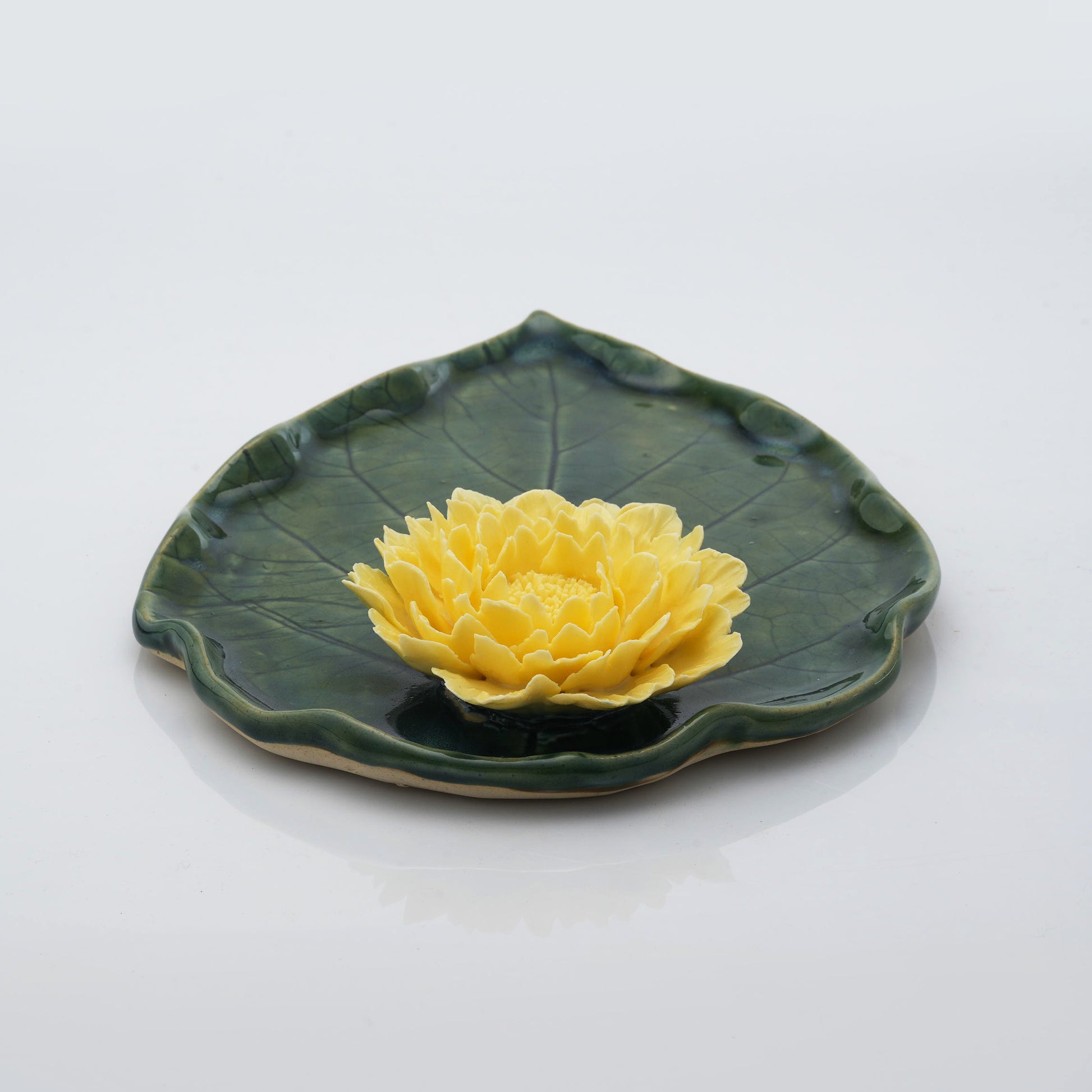 A stunning ceramic leaf plate, topped with a delicate peony, a blend of beauty and function.