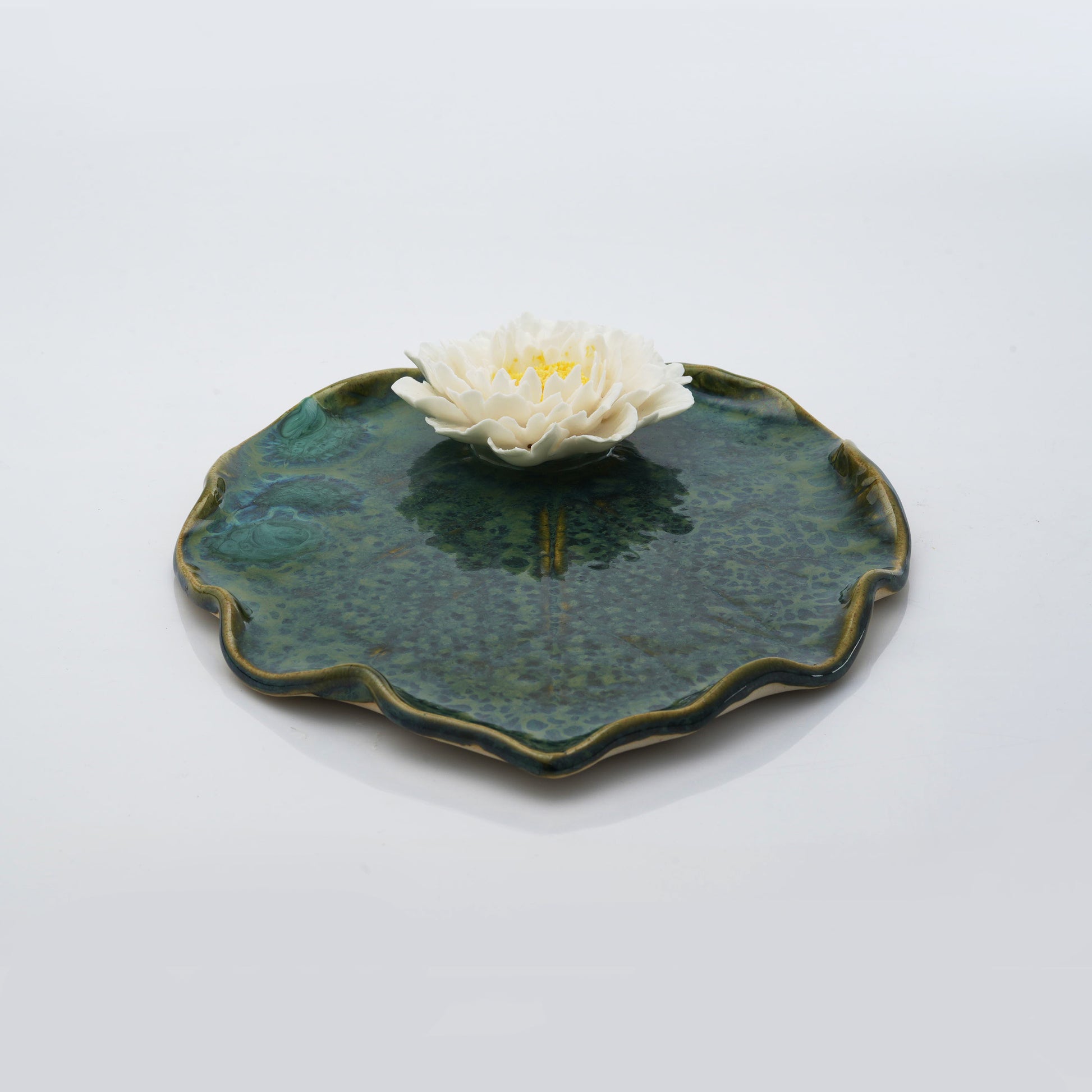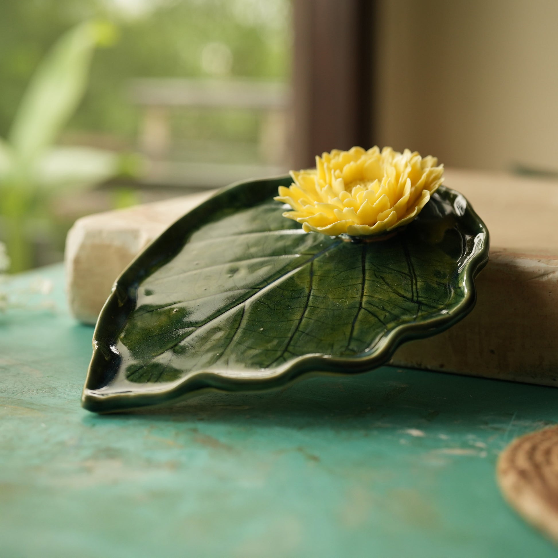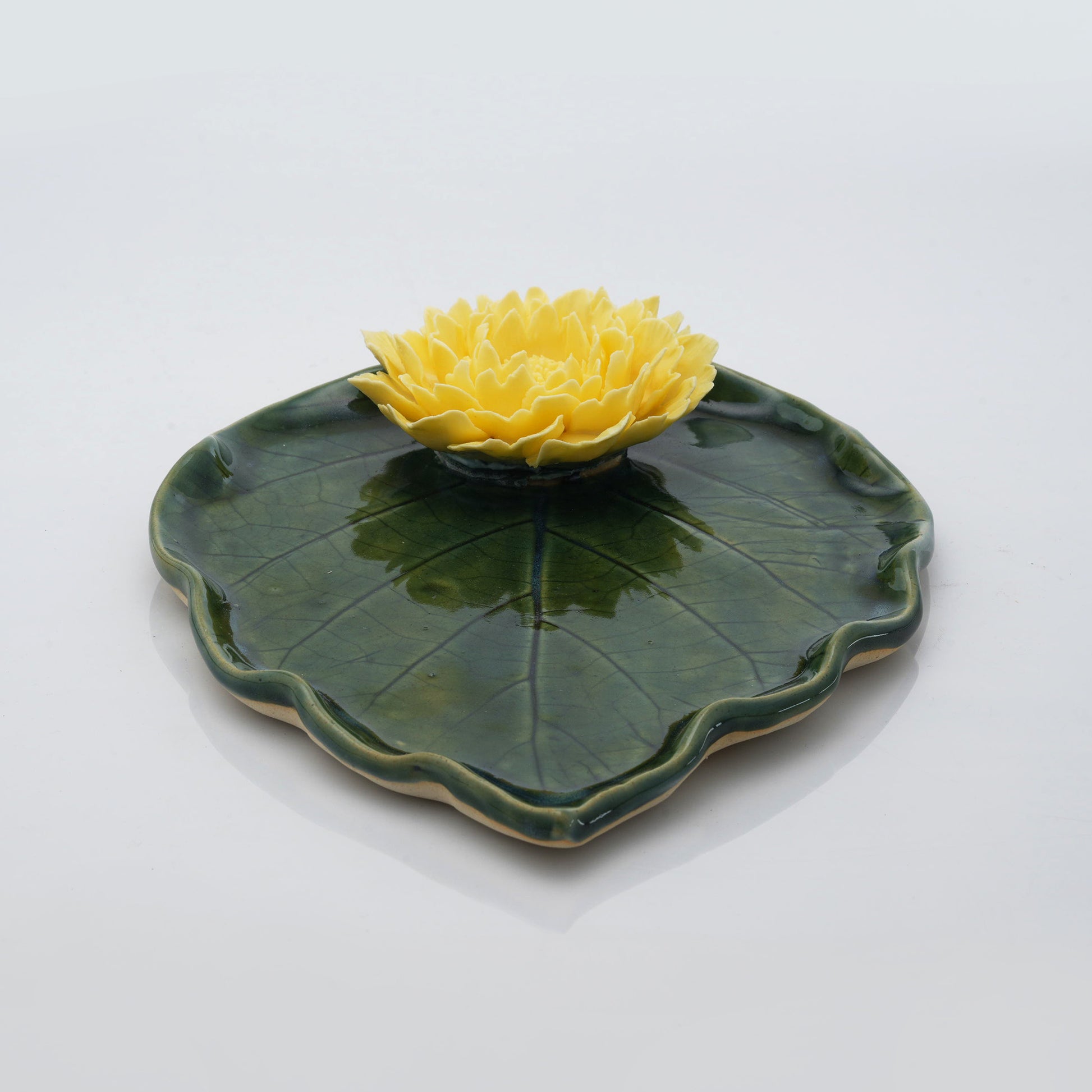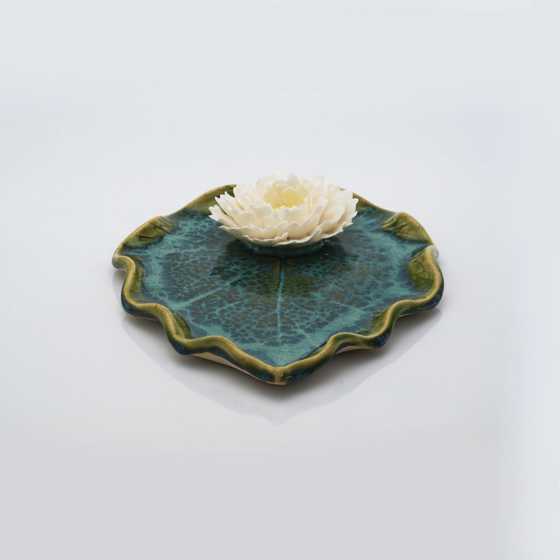 A stunning ceramic leaf plate, topped with a delicate peony, a blend of beauty and function.