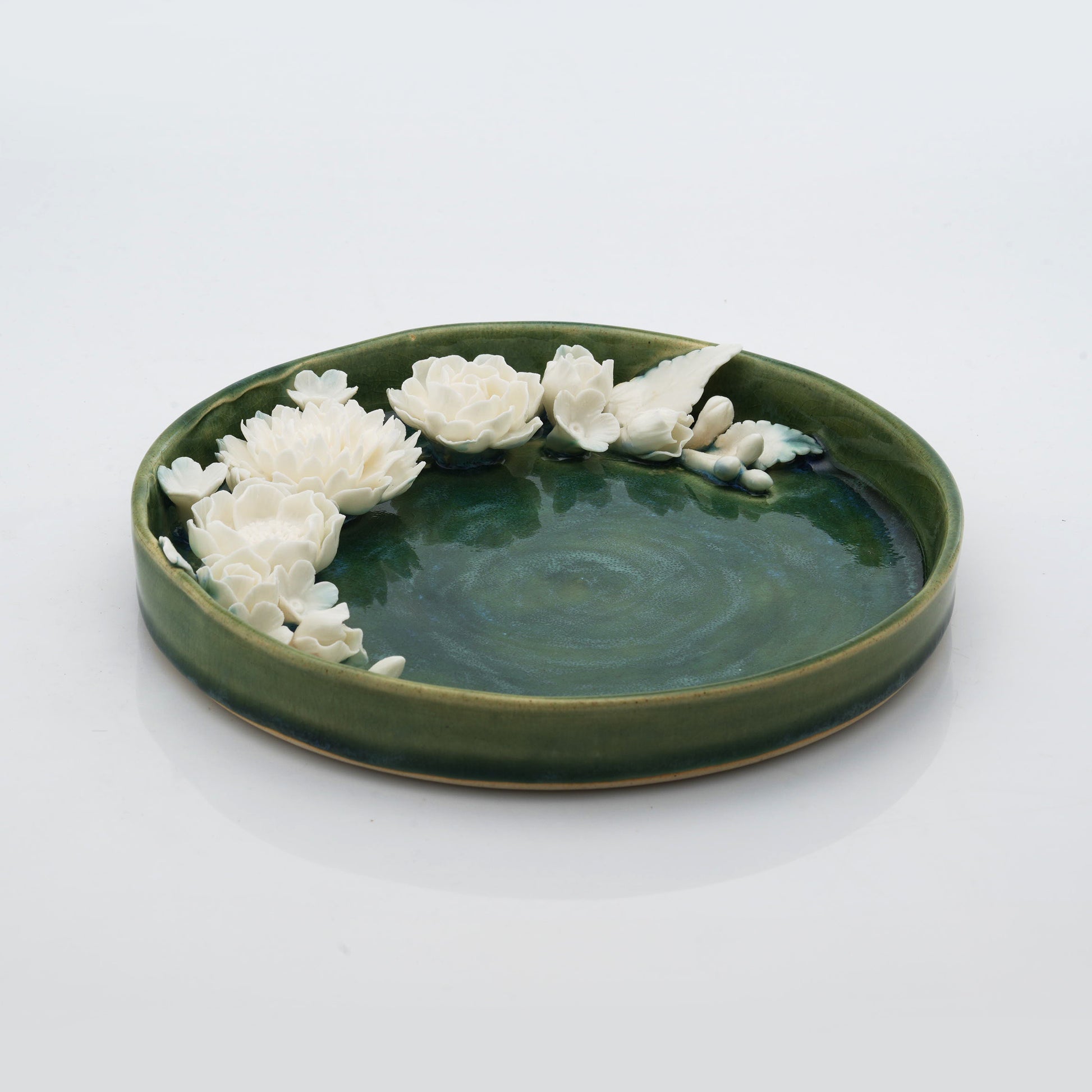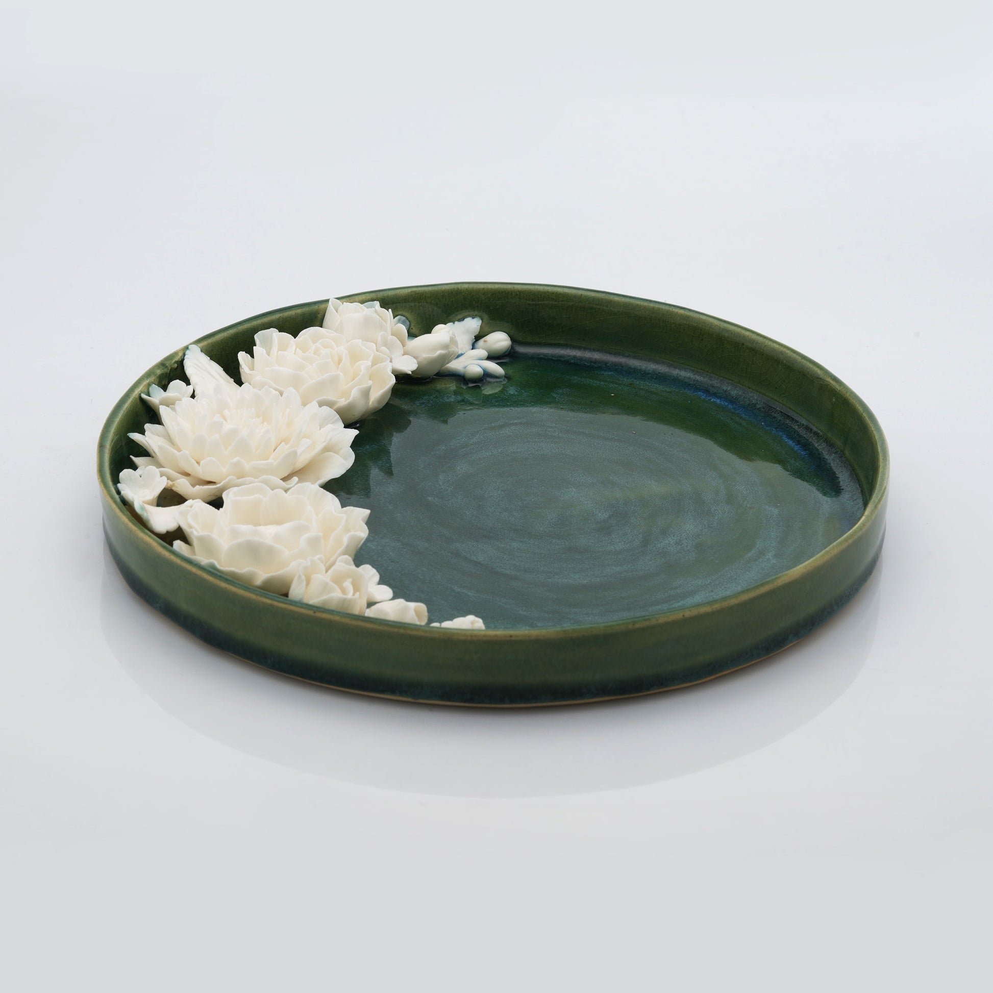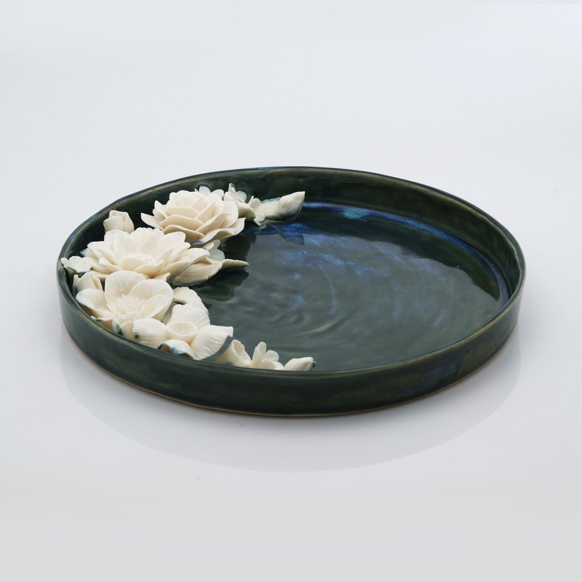 A thali decorated with sculpted white flowers, reflecting natural elegance.