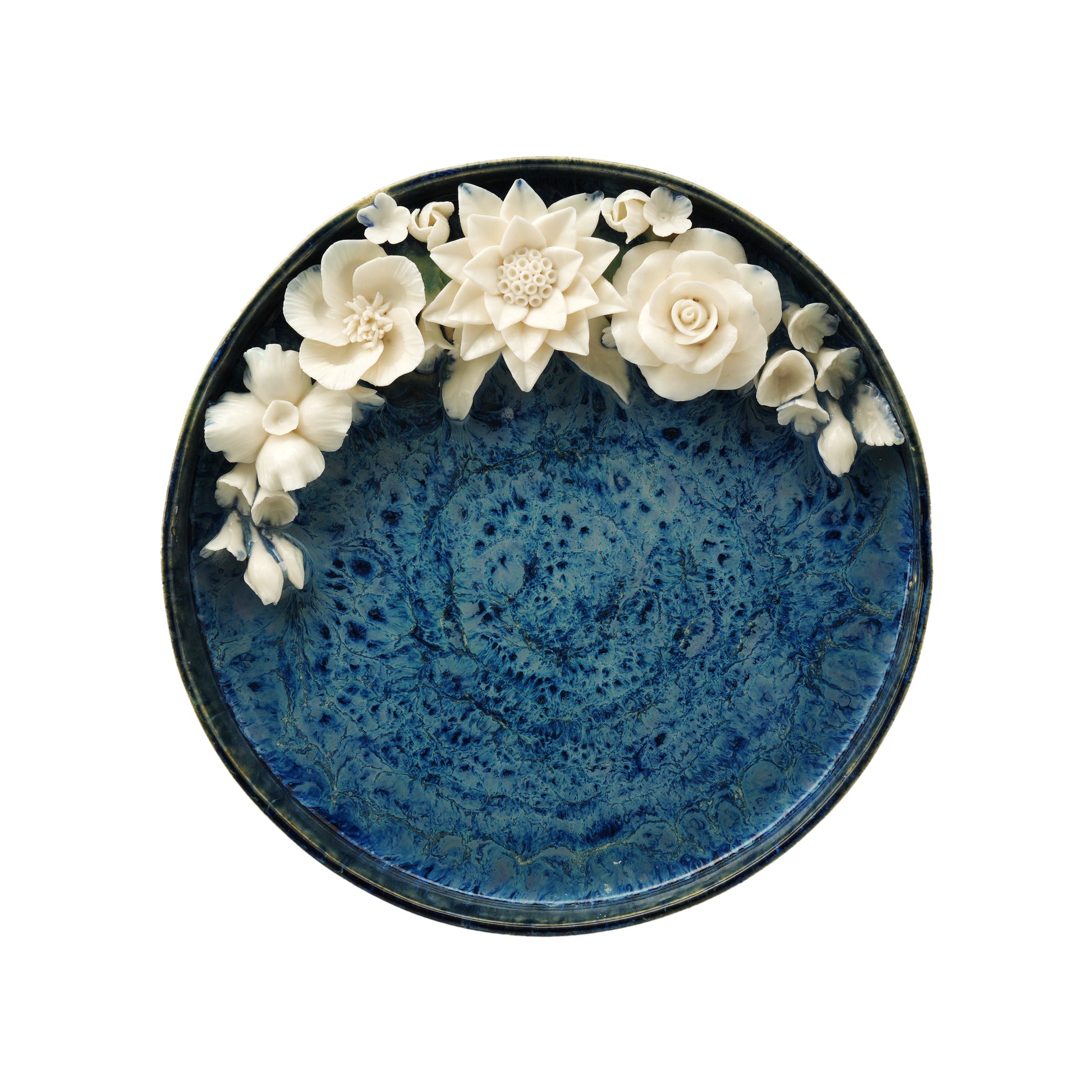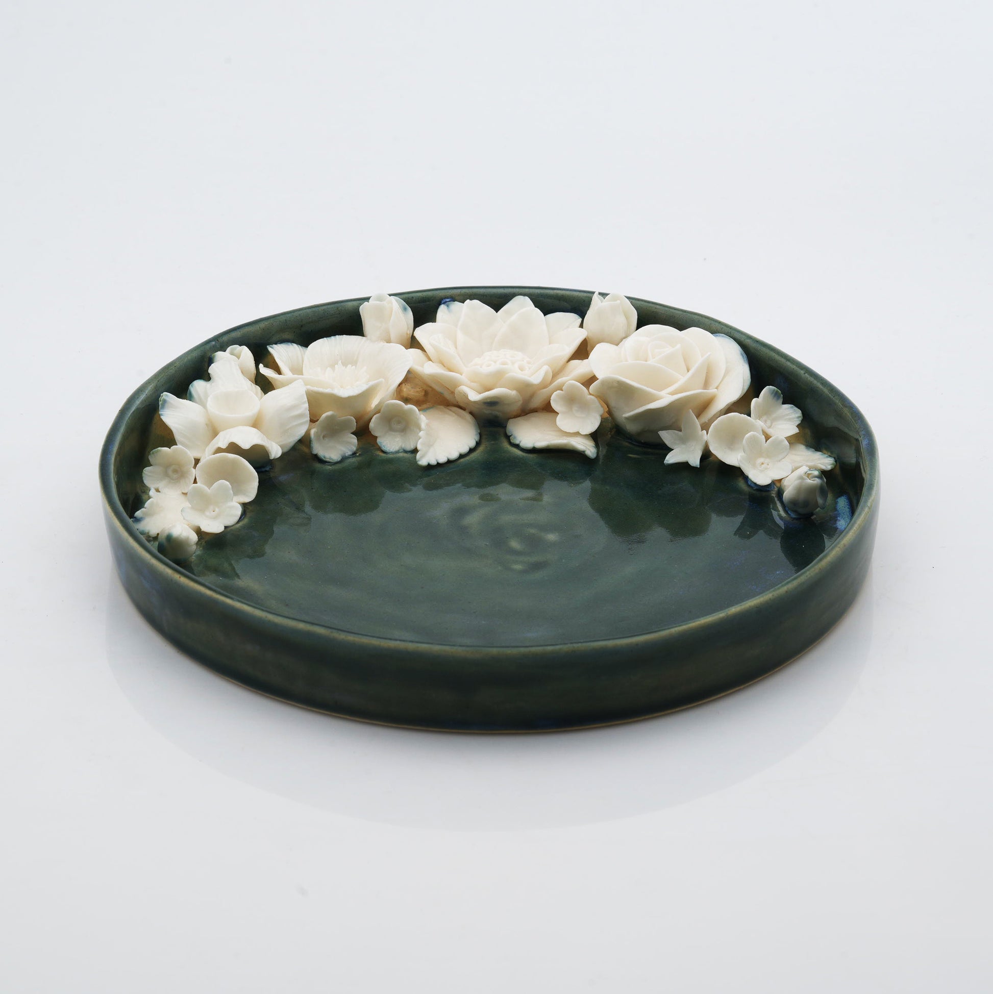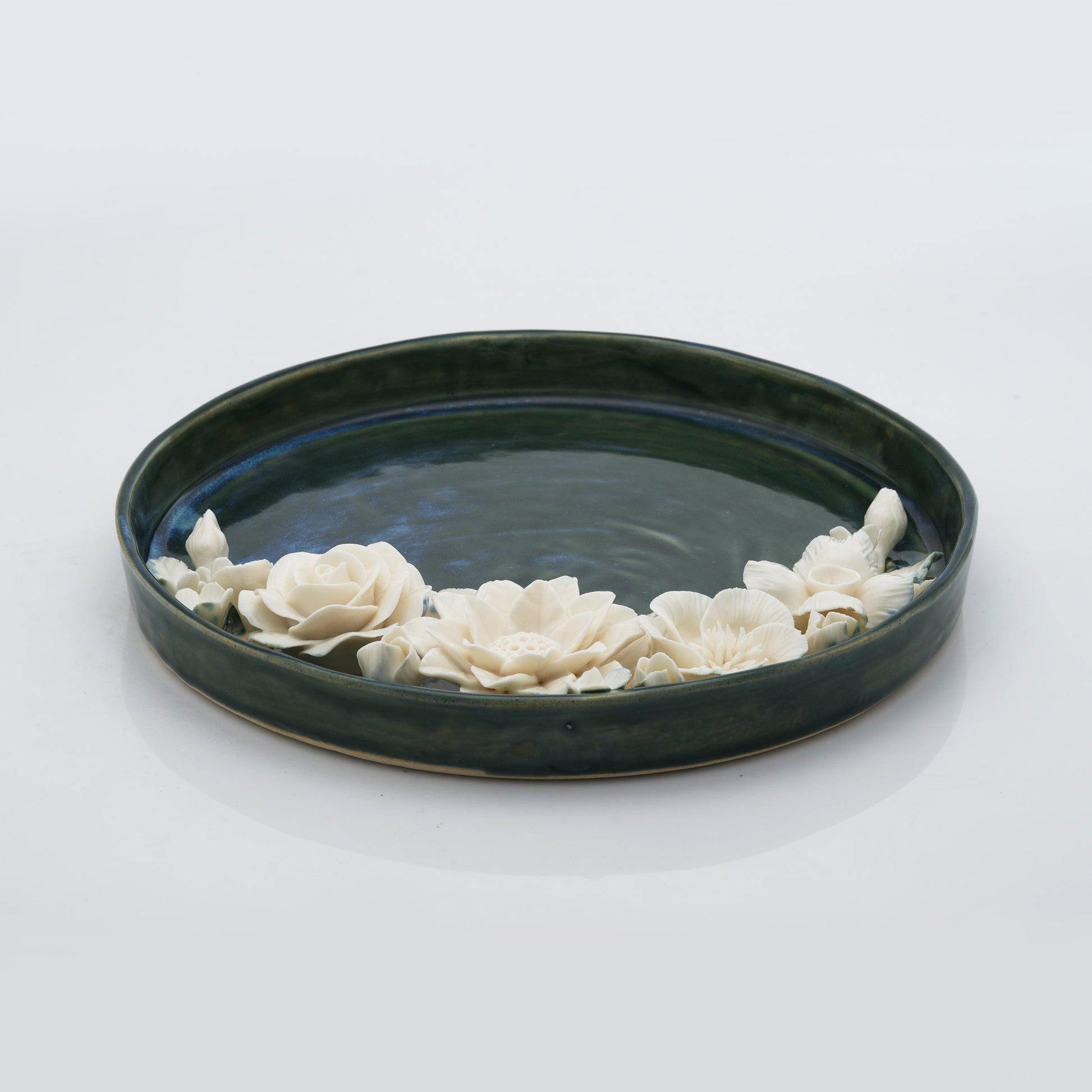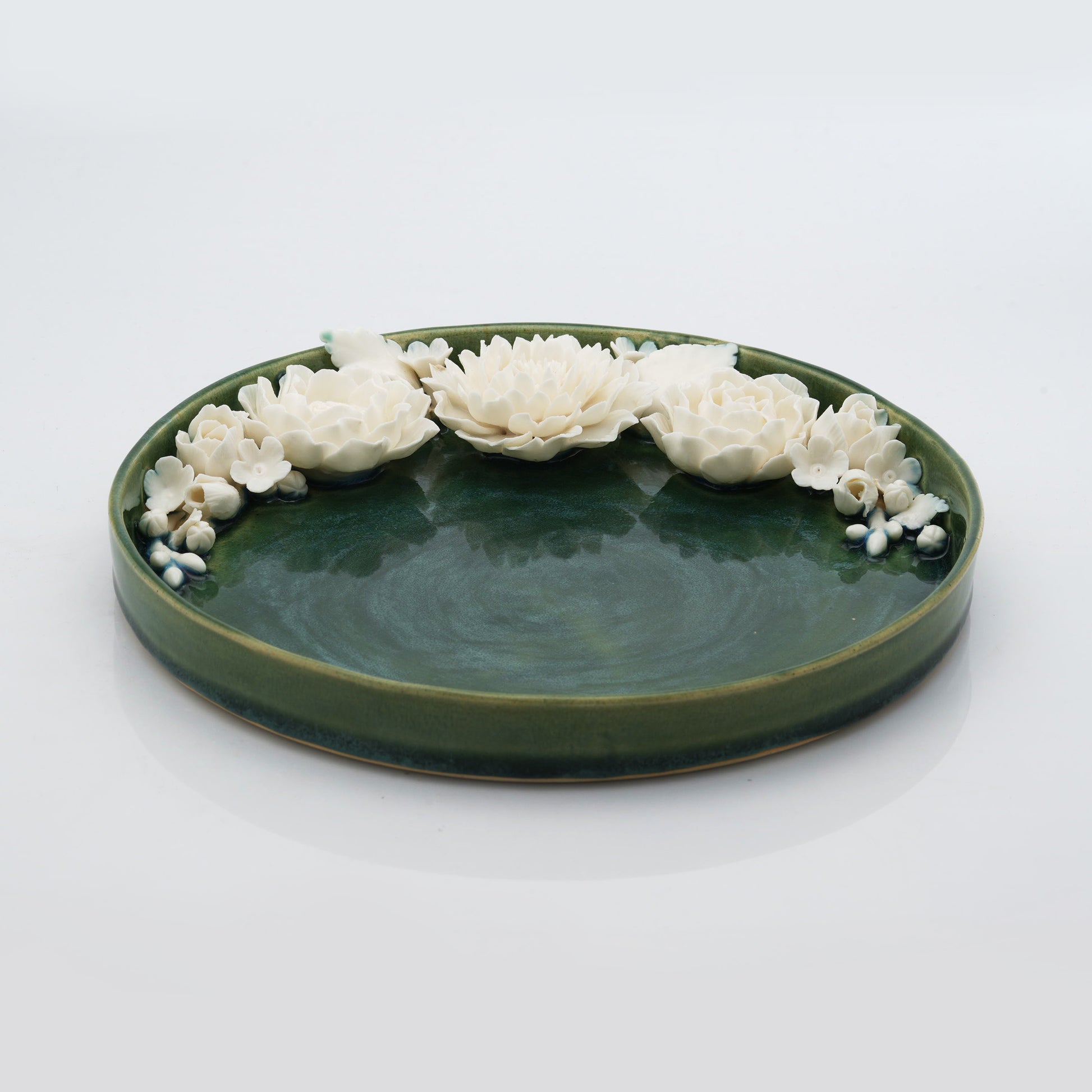 A thali decorated with sculpted white flowers, reflecting natural elegance.
